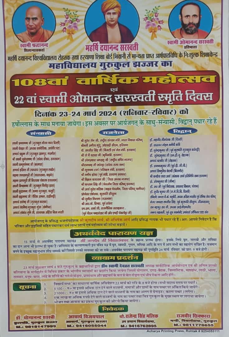 दिनांक 23-24 मार्च 2024 (शनिवार-रविवार) को हर्षोल्लास के साथ मनाया जायेगा। इस अवसर पर आर्यजगत् के साधु-संन्यासी, विद्वान् पधार रहे हैं