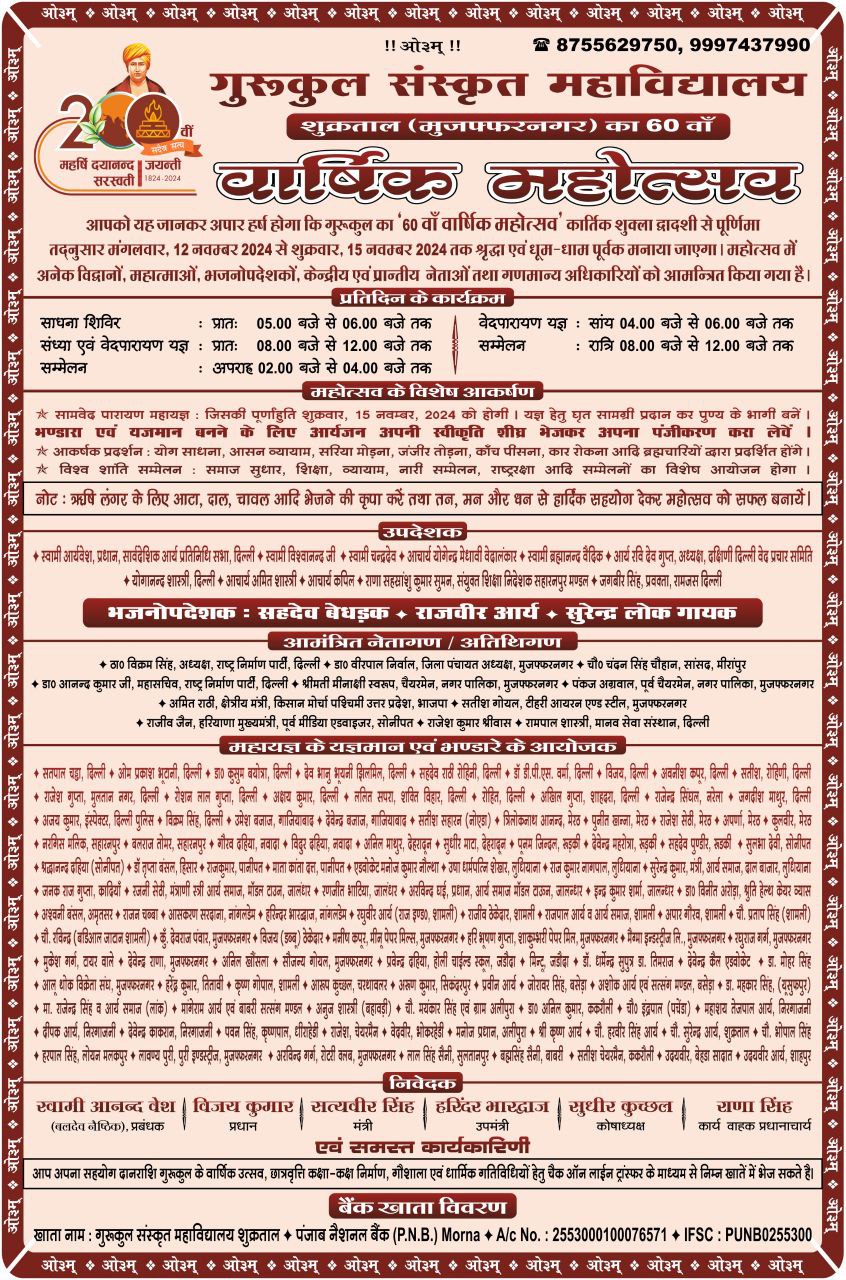 आपको यह जानकर अपार हर्ष होगा कि गुरूकुल का ’60 वाँ वार्षिक महोत्सव’ कार्तिक शुक्ला द्वादशी से पूर्णिमा तद्नुसार मंगलवार, 12 नवम्बर 2024 से शुक्रवार, 15 नवम्बर 2024 तक श्रृद्धा एवं धूम-धाम पूर्वक मनाया जाएगा। महोत्सव में अनेक विद्वानों, महात्माओं, भजनोपदेशकों, केन्द्रीय एवं प्रान्तीय नेताओं तथा गणमान्य अधिकारियों को आमन्त्रित किया गया है।