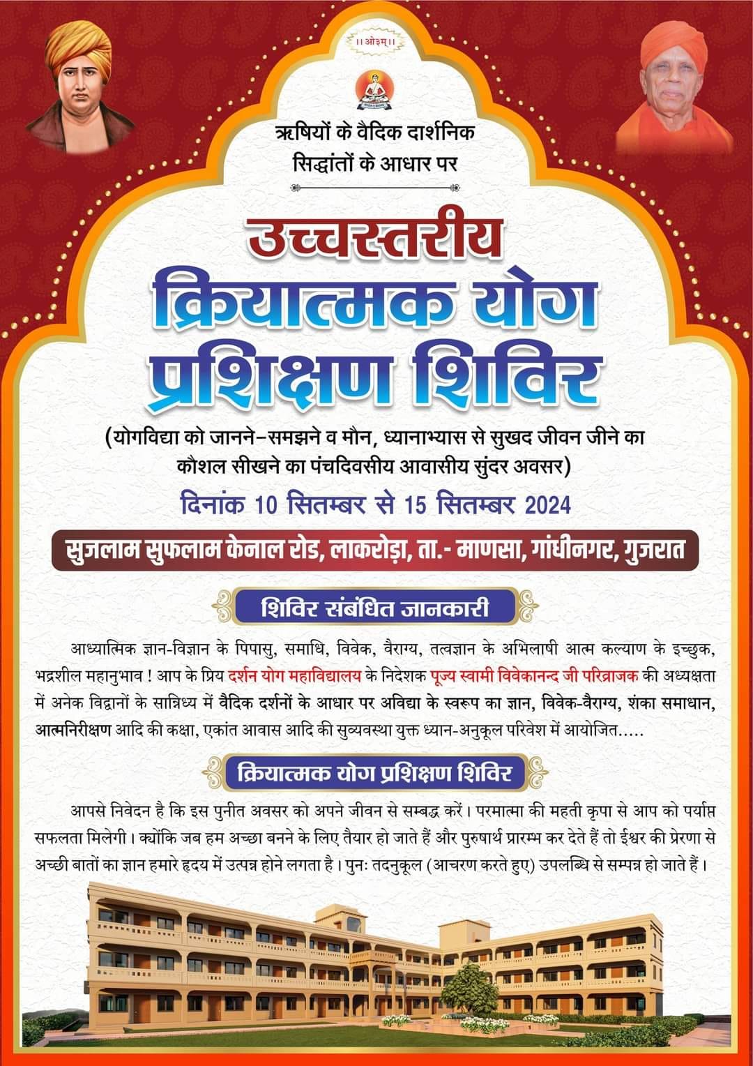 ऋषियों के वैदिक दार्शनिक सिद्धांतों के आधार पर उच्चस्तरीय क्रियात्मक योग प्रशिक्षण शिविर (योगविद्या को जानने-समझने व मौन, ध्यानाभ्यास से सुखद जीवन जीने का कौशल सीखने का पंचदिवसीय आवासीय सुंदर अवसर) दिनांक 10 सितम्बर से 15 सितम्बर 2024