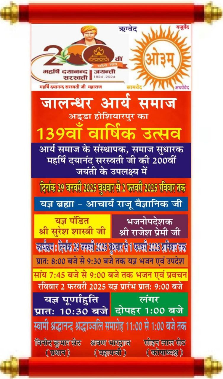 जालन्धर आर्य समाज अड्डा होशियारपुर का 139वाँ वार्षिक उत्सव