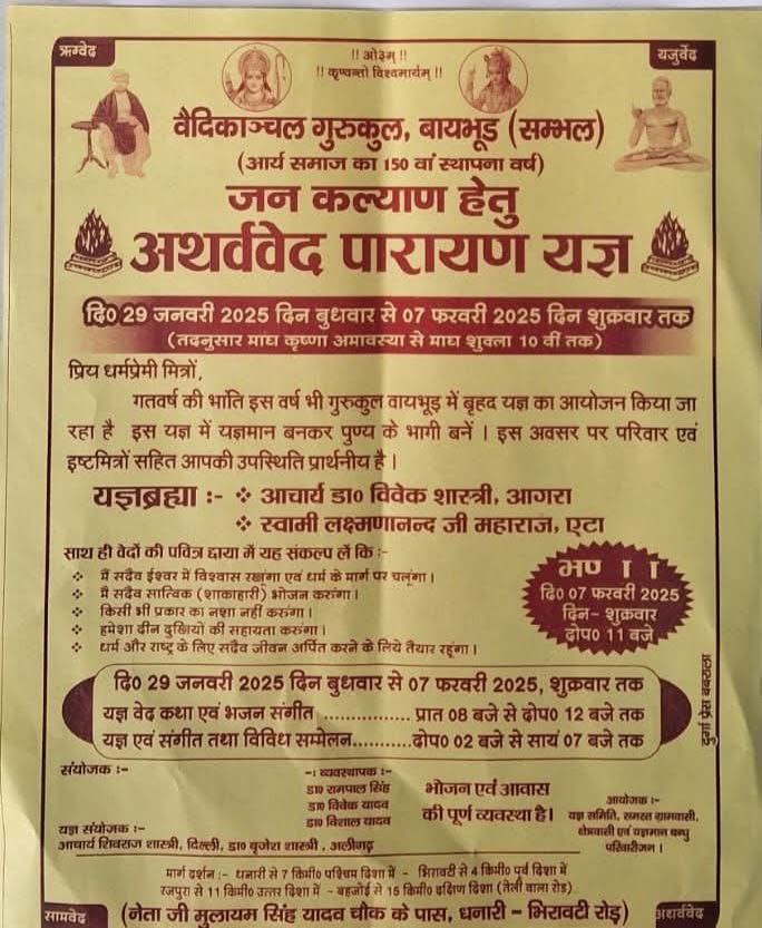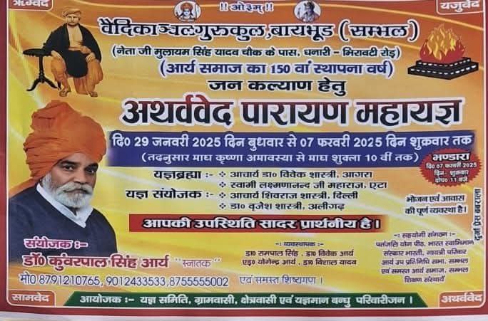 दि० 29 जनवरी 2025 दिन बुधवार से 07 फरवरी 2025, शुक्रवार तक यज्ञ वेद कथा एवं भजन संगीत यज्ञ एवं संगीत तथा विविध सम्मेलन.. प्रात 08 बजे से दोप० 12 बजे तक दोप० 02 बजे से सायं 07 बजे तक