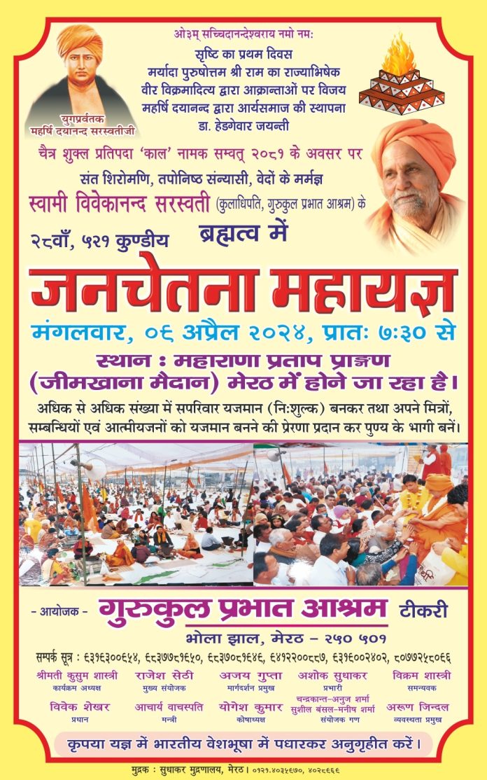 चैत्र शुक्ल प्रतिपदा ‘काल’ नामक सम्वत् २०८१ के अवसर परसंत शिरोमणि, तपोनिष्ठ संत, वेदों के मर्मज्ञ स्वामी विवेकानन्द सरस्वती (कुलाधिपति, गुरुकुल प्रभात आश्रम) के28वां, 521 कुंडीय ब्रह्मत्व में जनचेतना महायज्ञ |