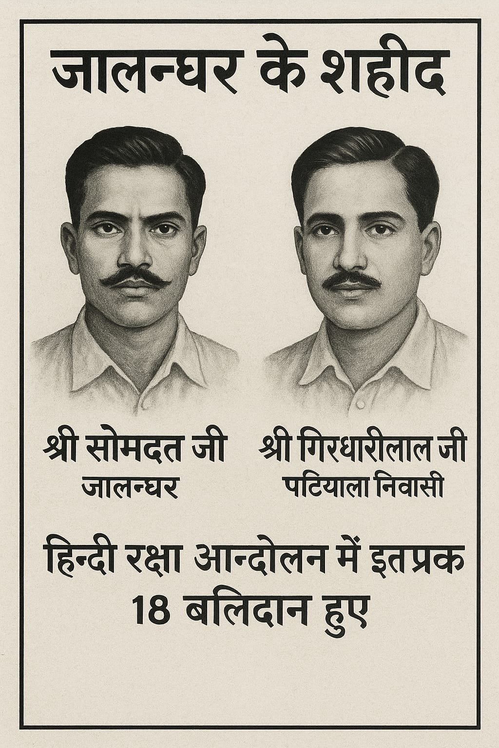 सभी लेखमहापुरुषों के जीवन जालन्धर के शहीद By Arya Samaj - September 19, 2025 0 27 FacebookTwitterPinterestWhatsApp ८ फरवरी ५८ को जालन्धर में श्री घनश्यामसिंह जोगुप्त के जुलूस पर पुलिस द्वारा गोली चलाई गई, जिसके कारण— श्री सोमदत्त जी, जालन्धर श्री गिरधारीलाल जी, पटियाला निवासी पुलिस की गोली से शहीद हो गये। हिन्दी रक्षा आन्दोलन में इस प्रकार कुल १८ बलिदान हुए। Curent posts: करतार सिंह सराभा: जीवन परिचय डॉ. चेम्पकरमण पिल्लई: स्वतंत्रता संग्राम के अग्रणी योद्धा वीर अब्दुल हमीद महाराणा प्रताप: ✨ बीना दास ✨ पंडित लेखराम जी पंडित तुलसीराम अमर बलिदानी चौधरी मातुराम जी श्री भैरोसिंह जी वीर शहीद सुमेरसिंह