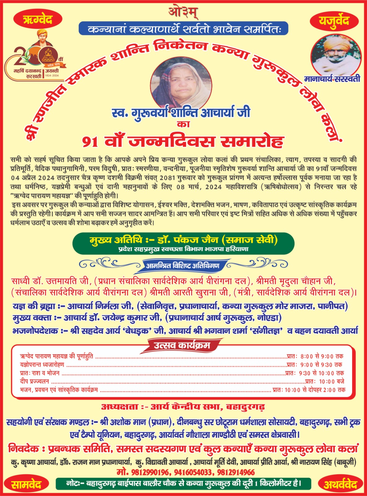 सभी को सहर्ष सूचित किया जाता है कि आपके अपने प्रिय कन्या गुरुकुल लोवा कलां की प्रथम संचालिका, त्याग, तपस्या व सादगी की प्रतिमूर्ति, वैदिक पथानुगामिनी, परम विदुषी, प्रातः स्मरणीया, वन्दनीया, पूजनीया स्मृतिशेष गुरूवर्या शान्ति आचार्या जी का 91वाँ जन्मदिवस 04 अप्रैल 2024 तदनुसार चैत्र कृष्ण दशमी विक्रमी संवत् 2081 गुरूवार को गुरूकुल प्रांगण में अत्यन्त हर्षोल्लास पूर्वक मनाया जा रहा है तथा धर्मनिष्ठ, यज्ञप्रेमी बन्धुओं एवं दानी महानुभावों के लिए 08 मार्च, 2024 महाविशरात्रि (ऋषिबोधोत्सव) से निरन्तर चल रहे “ऋग्वेद पारायण महायज्ञ की पूर्णाहुति होगी। इस अवसर पर गुरूकुल की कन्याओं द्वारा विशिष्ट योगासन, ईश्वर भक्ति, देशभक्ति भजन, भाषण, कवितापाठ एवं उत्कृष्ट सांस्कृतिक कार्यक्रम की प्रस्तुति रहेगी। कार्यक्रम में आप सभी सज्जन सादर आमन्त्रित हैं। आप सभी परिवार एवं इष्ट मित्रों सहित अधिक से अधिक संख्या में पहुँचकर धर्मलाभ उठाएँ व उत्सव की शोभा बढ़ाकर हमें अनुगृहीत करें।