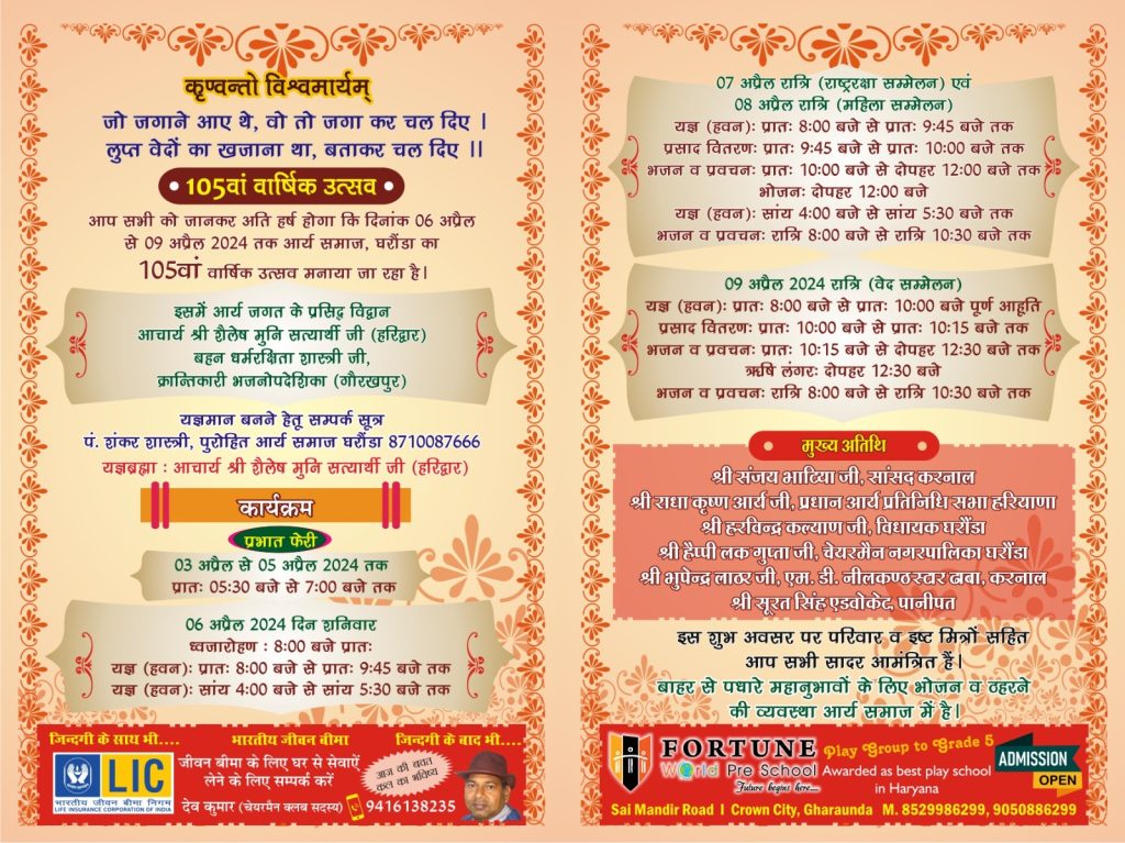 महर्षि दयानन्द सरस्वती की 200वीं जयन्ती एवं आर्य समाज घरौंडा का 105वां वार्षिक उत्सव
