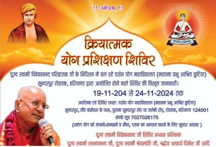 पूज्य स्वामी विवेकानन्द परिव्राजक जी के निर्देशन में चल रहे दर्शन योग महाविद्यालय (महात्मा प्रभु आश्रित कुटिया) सुन्दरपुर रोहतक, हरियाणा द्वारा आयोजित होने वाले शिविर की विस्तृत जानकारी।