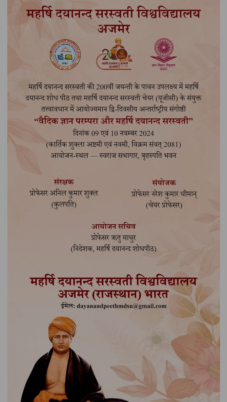 महर्षि दयानन्द सरस्वती के 200वीं जयन्ती वर्ष के उपलक्ष्य में महर्षि दयानन्द शोध पीठ तथा महर्षि दयानन्द सरस्वती चेयर (यूजीसी), महर्षि दयानन्द सरस्वती विश्वविद्यालय, अजमेर द्वारा दिनांक 09 एवं 10 नवम्बर 2024 को “वैदिक ज्ञान परम्परा और महर्षि दयानन्द सरस्वती विषयक द्विदिवसीय अन्तर्राष्ट्रीय वेद-संगोष्ठी का आयोजन किया जा रहा है। यह संगोष्ठी महर्षि दयानन्द के ‘वेदों की ओर लौटो’ एवं ‘कृण्वन्तो विश्वमार्यम्’ के उद्घोष को रेखांकित करने का प्रयास करेगी। साथ ही वैदिक ज्ञान परम्परा के व्यापक तत्त्वविमर्श एवं वर्तमान समाज में वैदिकचिन्तन को स्थापित करने के सार्वभौमिक लक्ष्यों की प्राप्ति के लिए अग्रसर करने वाला होगा।