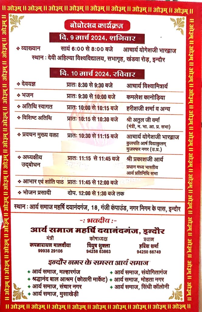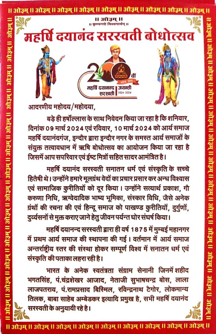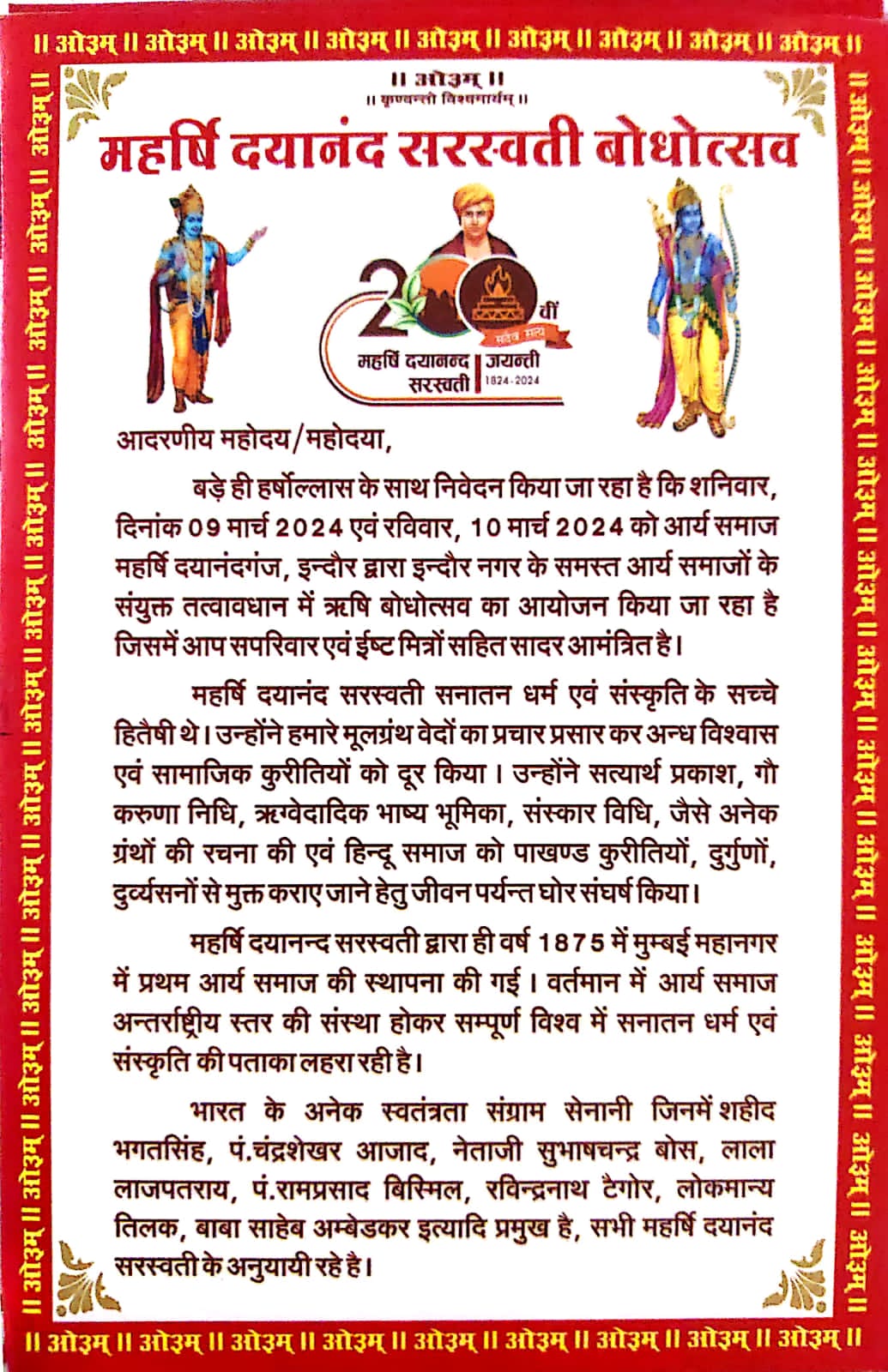 बड़े ही हर्षोल्लास के साथ निवेदन किया जा रहा है कि शनिवार, दिनांक 09 मार्च 2024 एवं रविवार, 10 मार्च 2024 को आर्य समाज महर्षि दयानंदगंज, इन्दौर द्वारा इन्दौर नगर के समस्त आर्य समाजों के संयुक्त तत्वावधान में ऋषि बोधोत्सव का आयोजन किया जा रहा है जिसमें आप सपरिवार एवं ईष्ट मित्रों सहित सादर आमंत्रित है।