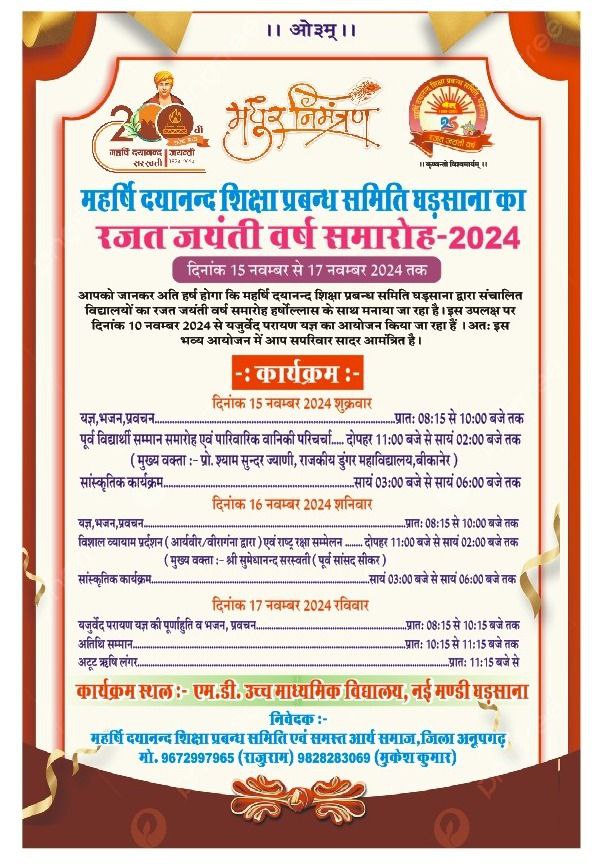 आपको जानकर अति हर्ष होगा कि महर्षि दयानन्द शिक्षा प्रबन्ध समिति घड़साना द्वारा संचालित विद्यालयों का रजत जयंती वर्ष समारोह हर्षोल्लास के साथ मनाया जा रहा है। इस उपलक्ष पर दिनांक 10 नवम्बर 2024 से यजुर्वेद परायण यज्ञ का आयोजन किया जा रहा हैं। अतः इस भव्य आयोजन में आप सपरिवार सादर आमंत्रित है।