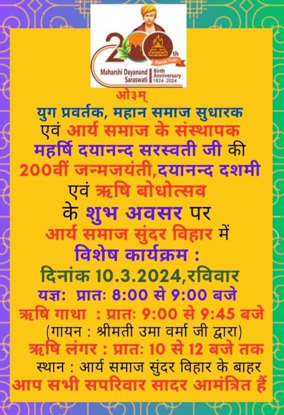 युग प्रवर्तक, महान समाज सुधारक एवं आर्य समाज के संस्थापक महर्षि दयानन्द सरस्वती जी की 200वीं जन्मजयंती, दयानन्द दशमी एवं ऋषि बोधोत्सव के शुभ अवसर पर आर्य समाज सुंदर विहार में।
