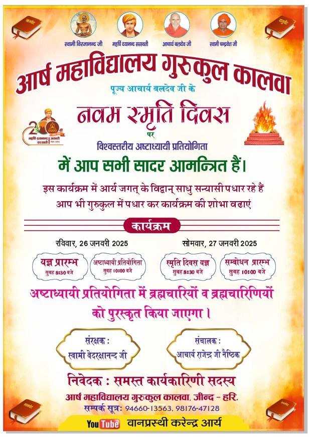इस कार्यक्रम में आर्य जगत् के विद्वान् साधु सन्यासी पधार रहे हैं आप भी गुरुकुल में पधार कर कार्यक्रम की शोभा वढाएं