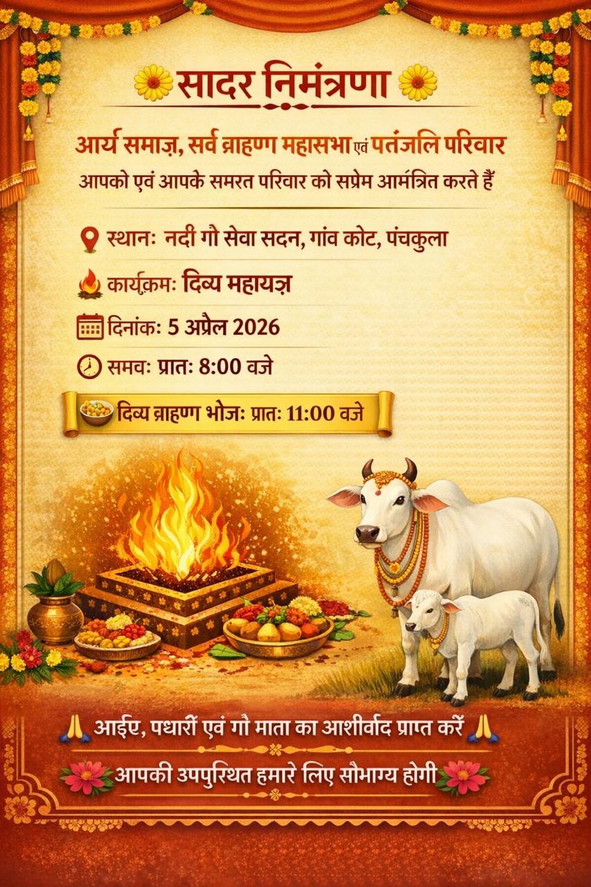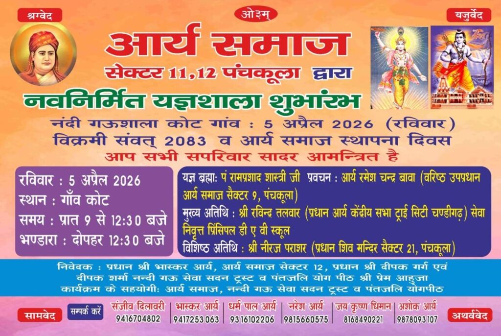 हरियाणा के पंचकूला स्थित गाँव कोट में आर्य समाज सेक्टर 11–12, सर्व ब्राह्मण महासभा एवं पतंजलि परिवार के संयुक्त तत्वावधान में नव निर्मित यज्ञशाला के शुभारंभ तथा दिव्य महायज्ञ का अत्यंत भव्य एवं श्रद्धामय आयोजन रविवार, 5 अप्रैल 2026 को आयोजित किया जा रहा है। यह पावन समारोह नंदी गौशाला, कोट गाँव, पंचकूला में संपन्न होगा, जहाँ बड़ी संख्या में श्रद्धालुओं, धर्मप्रेमियों और क्षेत्रवासियों के सम्मिलित होने की संभावना है।