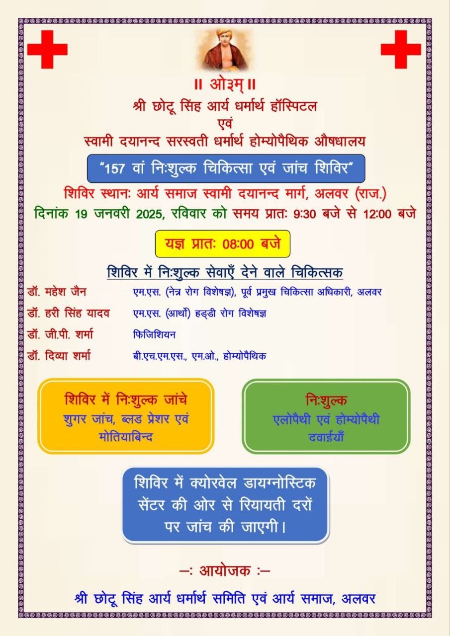 शिविर का दिनांक-19 जनवरी 2025 दिन रविवार समय- प्रातः 11 बजे से सायं 4 बजे