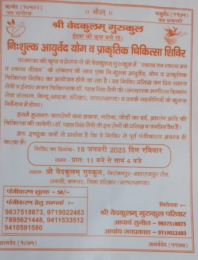 परमात्मा की कृपा व प्रेरणा से श्री वेदकुलम् गुरुकुल में “स्वस्थ तन स्वस्थ मन व स्वस्थ जीवन” के संकल्प के साथ एक निःशुल्क आयुर्वेद, योग व प्राकृतिक चिकित्सा शिविर का आयोजन होने जा रहा है। यह शिविर प्रसिद्ध जन प्रिय समाज सेवी व ईश्वर भक्त चिकित्सक डॉ. पहल सिंह सैनी जी (संस्थापक भागीरथ दिव्यांन सेवा संस्थान, बिन्दु खड्क, हरिद्वार, उत्तराखण्ड) व उनके सहयोगियों के कुशल निर्देशन में होगा।