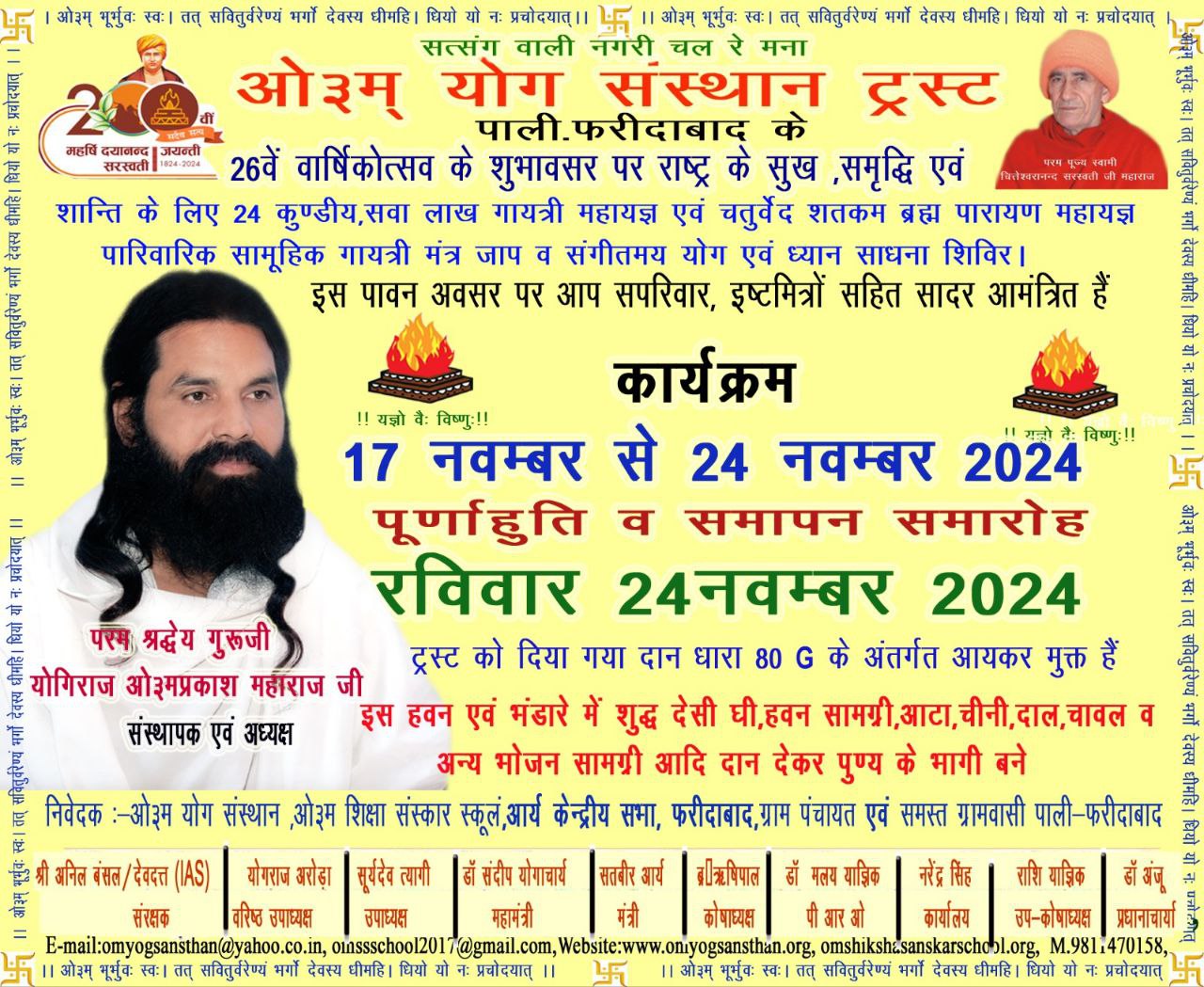 26वें वार्षिकोत्सव के शुभावसर पर राष्ट्र के सुख, समृद्धि एवं शान्ति के लिए 24 कुण्डीय, सवा लाख गायत्री महायज्ञ एवं चतुर्वेद शतकम ब्रह्म पारायण पारिवारिक सामूहिक गायत्री मंत्र जाप व संगीतमय योग एवं ध्यान साधना शिविर । महायज्ञ इस पावन अवसर पर आप सपरिवार, इष्टमित्रों सहित सादर आमंत्रित हैं