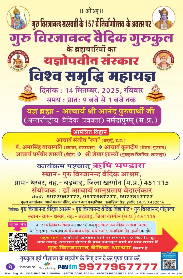 गुरु परंपरा के आलोक में, गुरु विरजानन्द सरस्वती के 157वें निर्वाणोत्सव के पावन अवसर पर गुरु विरजानन्द वैदिक गुरुकुल के ब्रह्मचारियों का यज्ञोपवीत संस्कार तथा विश्व समृद्धि महायज्ञ का भव्य आयोजन किया जा रहा है।