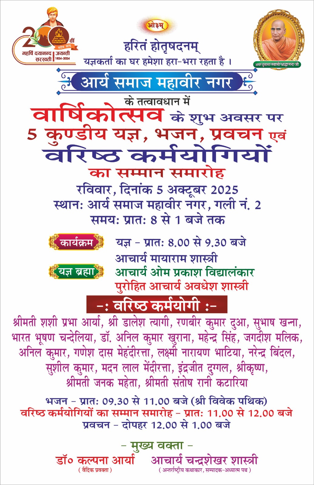 महर्षि दयानन्द जयन्ती सरस्वती 104-3024 के उपलक्ष्य में आर्य समाज महावीर नगर के तत्वावधान में भव्य वार्षिकोत्सव का आयोजन किया जा रहा है। वैदिक संदेश “हरितं होतृषदनम् — यज्ञकर्ता का घर हमेशा हरा-भरा रहता है” के उद्घोष के साथ यह कार्यक्रम वैदिक संस्कृति, कर्मयोग और समाजसेवा को समर्पित रहेगा।