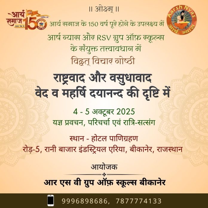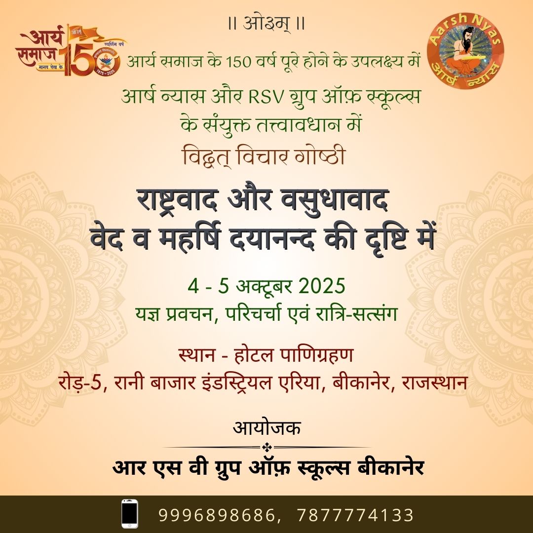 आर्य समाज की स्थापना के 150 वर्ष पूर्ण होने के उपलक्ष्य में आर्ष न्यास और RSV ग्रुप ऑफ़ स्कूल्स के संयुक्त तत्त्वावधान में एक भव्य विद्वत् विचार गोष्ठी का आयोजन किया जा रहा है।