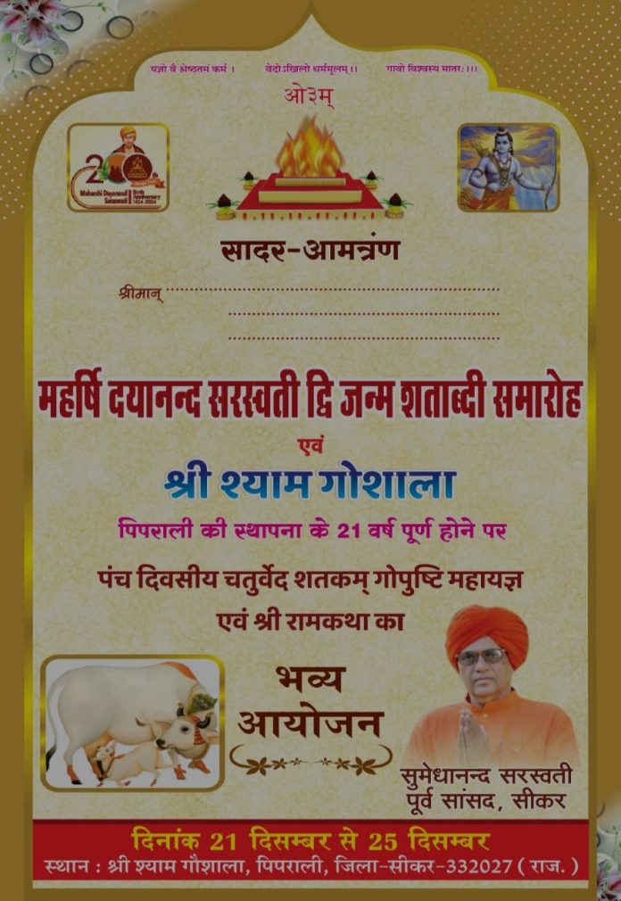 महर्षि दयानन्द द्वि जन्म शताब्दी समारोह समिति श्री श्याम गौशाल समिति, पिपराली वैदिक सेवा संस्थान, पिपराली सीकर (राज.) (332027)