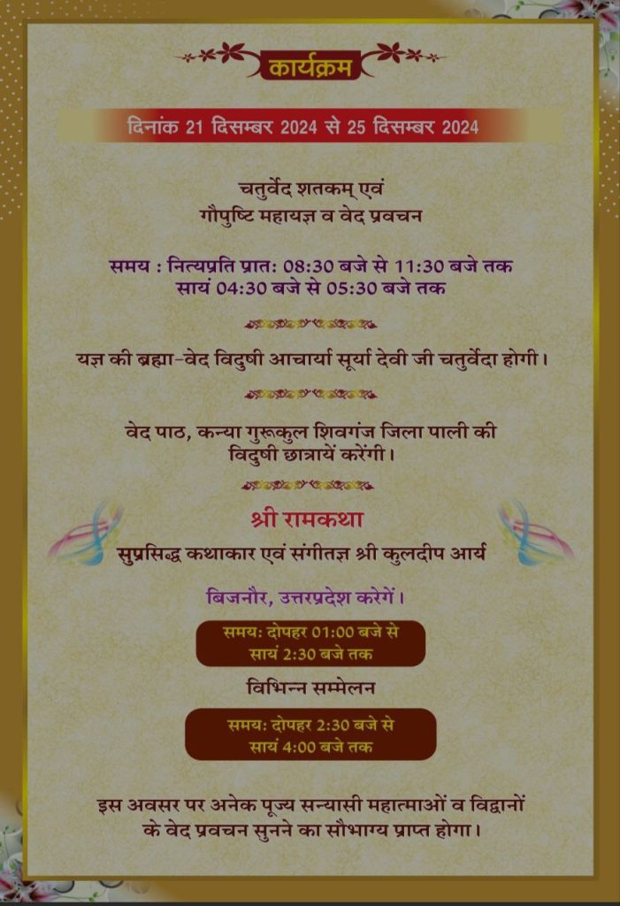 वेद पाठ, कन्या गुरूकुल शिवगंज जिला पाली की विदुषी छात्रायें करेंगी।