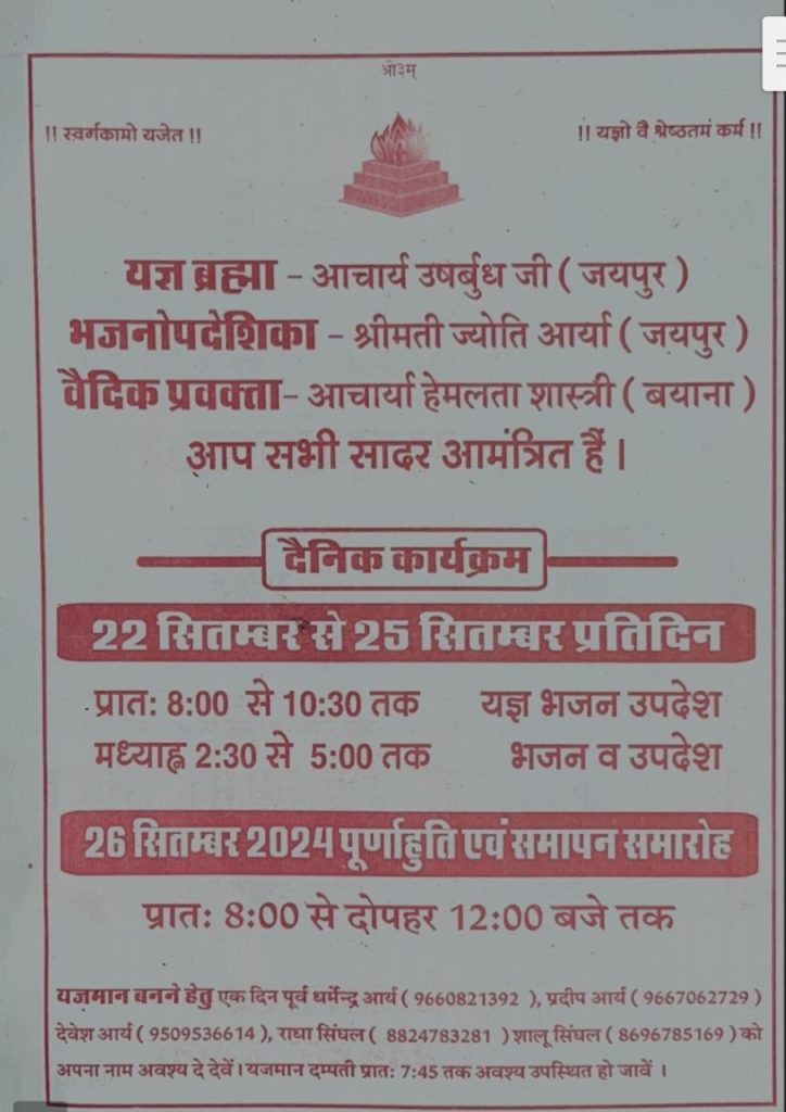 यजमान बनने हेतु एक दिन पूर्व धर्मेन्द्र आर्य (9660821392), प्रदीप आर्य (9667062729) देवेश आर्य (9509536614), राधा सिंघल (8824783281) शालू सिंघल (8696785169) को अपना नाम अवश्य दे देवें। यजमान दम्पती प्रातः 7:45 तक अवश्य उपस्थित हो जावें ।