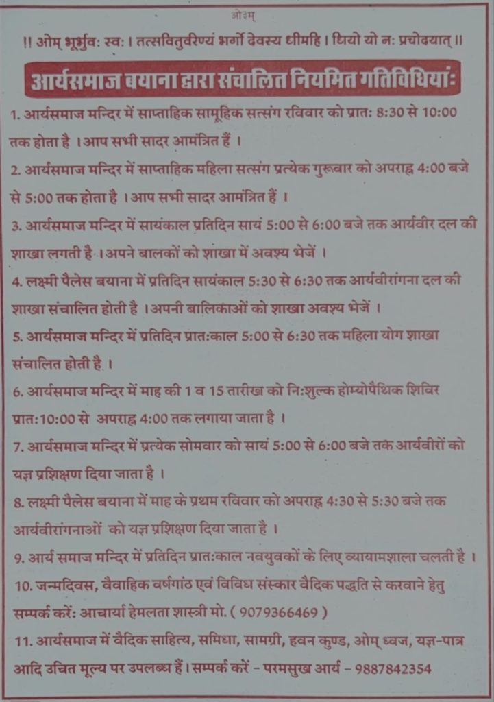 - लक्ष्मी पैलेस बयाना में प्रतिदिन सायंकाल 5:30 से 6:30 तक आर्यवीरांगना दल की शाखा संचालित होती है। अपनी बालिकाओं को शाखा अवश्य भेजें ।