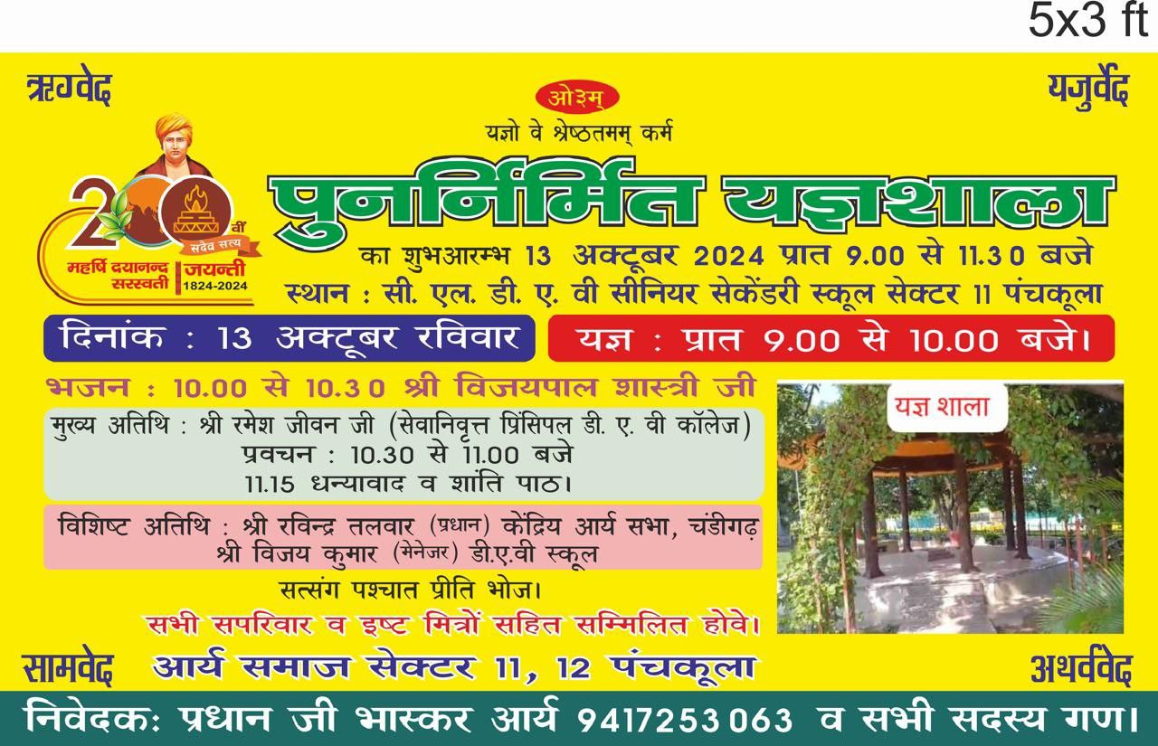 पुनर्निर्मित यज्ञशाला का शुभआरम्भ : 13 अक्टूबर 2024 प्रात 9.00 से 11.30 बजे