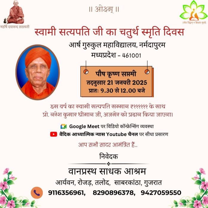 इस अवसर पर वानप्रस्थ साधक आश्रम द्वारा प्रो. नरेश कुमार धीमान जी को स्वामी सत्यपति सम्मान ₹११११११ के साथ प्रदान किया जाएगा।