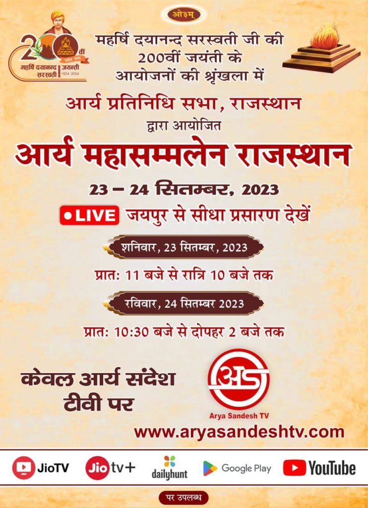 महान् समाज सुधारक, आर्यसमाज के संस्थापक महर्षि दयानन्द सरस्वती की 200 वीं जयन्ती के उपलक्ष्य में आर्य प्रतिनिधि सभा राजस्थान आर्य महासम्मेलन ।