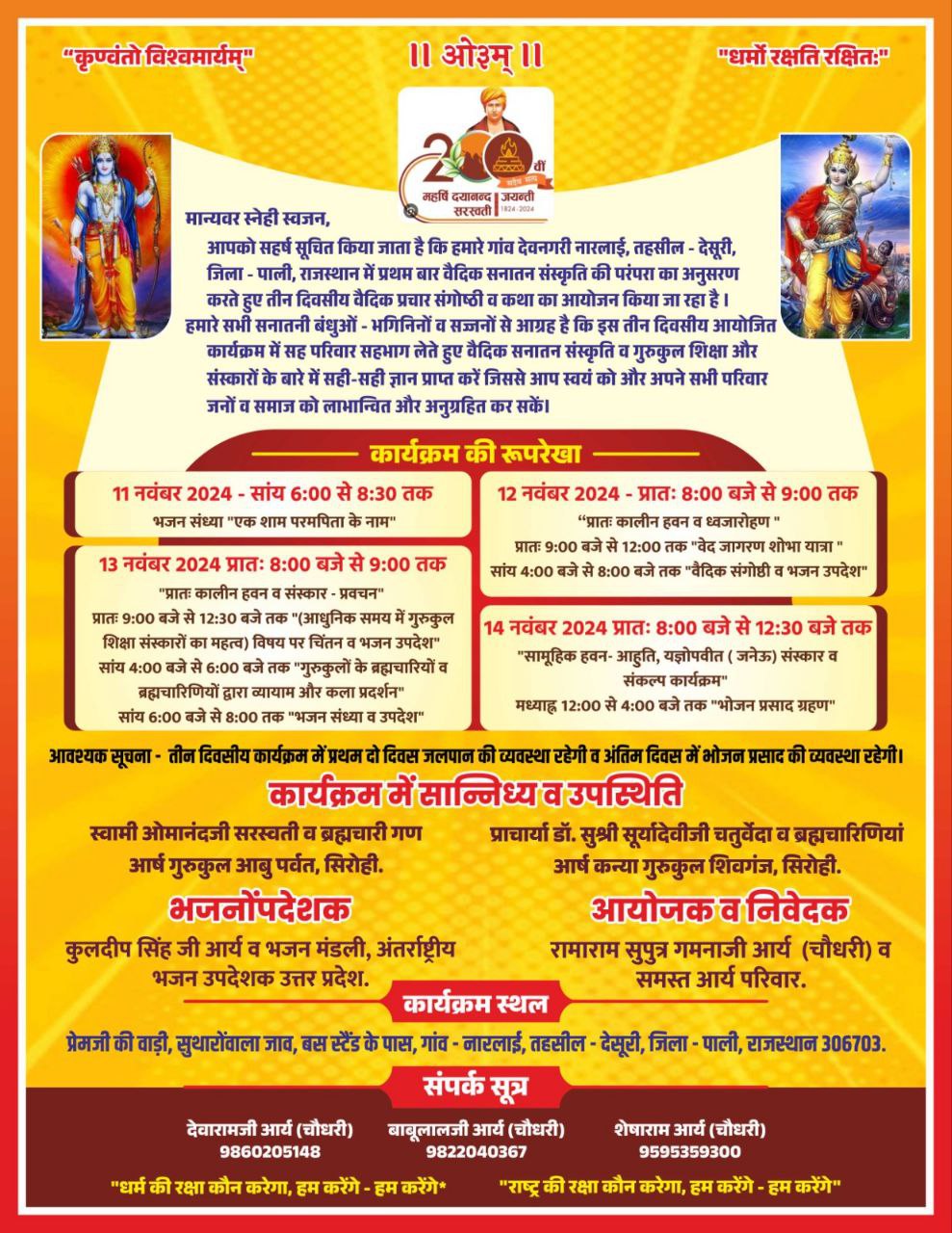 आपको सहर्ष सूचित किया जाता है कि हमारे गांव देवनगरी नारलाई, तहसील देसूरी, जिला – पाली, राजस्थान में प्रथम बार वैदिक सनातन संस्कृति की परंपरा का अनुसरण करते हुए तीन दिवसीय वैदिक प्रचार संगोष्ठी व कथा का आयोजन किया जा रहा है। हमारे सभी सनातनी बंधुओं भगिनिनों व सज्जनों से आग्रह है कि इस तीन दिवसीय आयोजित कार्यक्रम में सह परिवार सहभाग लेते हुए वैदिक सनातन संस्कृति व गुरुकुल शिक्षा और संस्कारों के बारे में सही-सही ज्ञान प्राप्त करें जिससे आप स्वयं को और अपने सभी परिवार जनों व समाज को लाभान्वित और अनुग्रहित कर सकें।