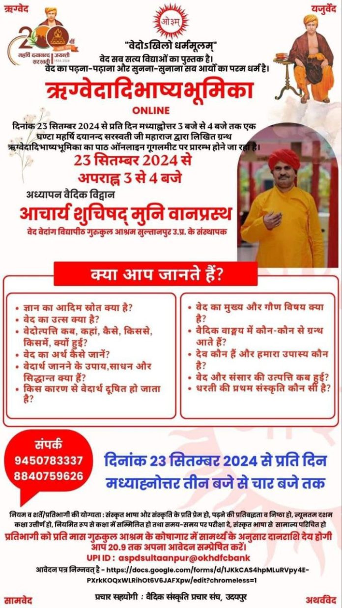 एक घण्टा महर्षि दयानन्द सरस्वती जी महाराज द्वारा लिखित ग्रन्थ ऋग्वेदादिभाष्यभूमिका का पाठ ऑनलाइन गूगलमीट पर प्रारम्भ होने जा रहा है।