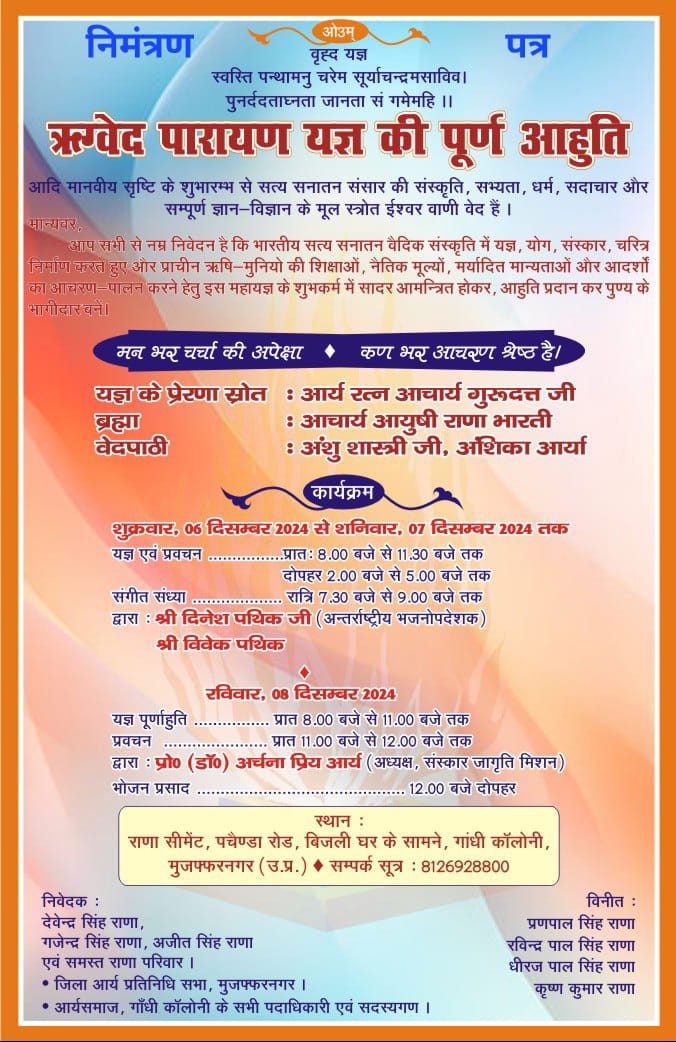 आप सभी से नम्र निवेदन है कि भारतीय सत्य सनातन वैदिक संस्कृति में यज्ञ, योग, संस्कार, चरित्र निमर्माण करत हुए और प्राचीन ऋषि-मुनियो की शिक्षाओं, नैतिक मूल्यों, मर्यादित मान्यताओं और आदर्शों का आचरण-पालन करने हेतु इस महायज्ञ के शुभकर्म में सादर आमन्त्रित होकर, आहुति प्रदान कर पुण्य के भागीदार बनें।