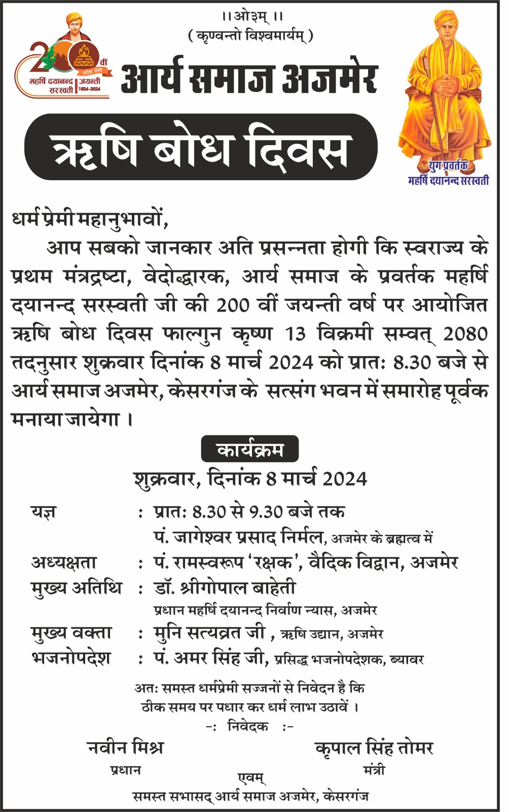 आप सबको जानकार अति प्रसन्नता होगी कि स्वराज्य के प्रथम मंत्रद्रष्टा, वेदोद्धारक, आर्य समाज के प्रवर्तक महर्षि दयानन्द सरस्वती जी की 200 वीं जयन्ती वर्ष पर आयोजित ऋषि बोध दिवस फाल्गुन कृष्ण 13 विक्रमी सम्वत् 2080 तदनुसार शुक्रवार दिनांक 8 मार्च 2024 को प्रातः 8.30 बजे से आर्य समाज अजमेर, केसरगंज के सत्संग भवन में समारोह पूर्वक मनाया जायेगा ।