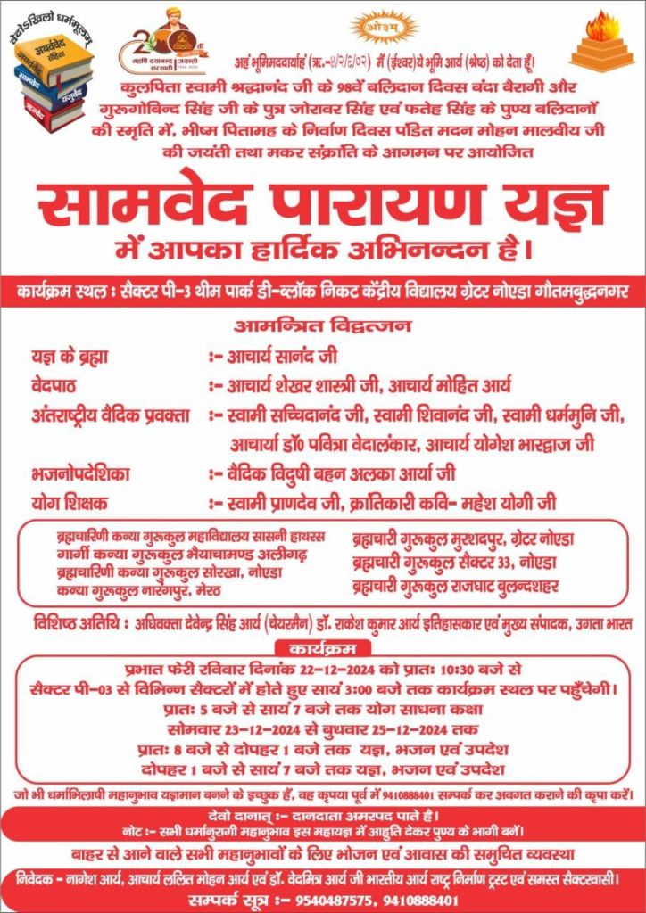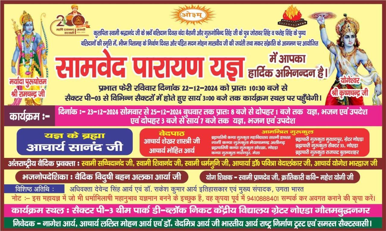 निवेदक – नागेश आर्य, आचार्य ललित मोहन आर्य एवं डॉ. वेदमित्र आर्य जी भारतीय आर्य राष्ट्र निर्माण ट्रस्ट एवं समस्त सैक्टरवासी। सम्पर्क सूत्र :- 9540487575, 9410888401