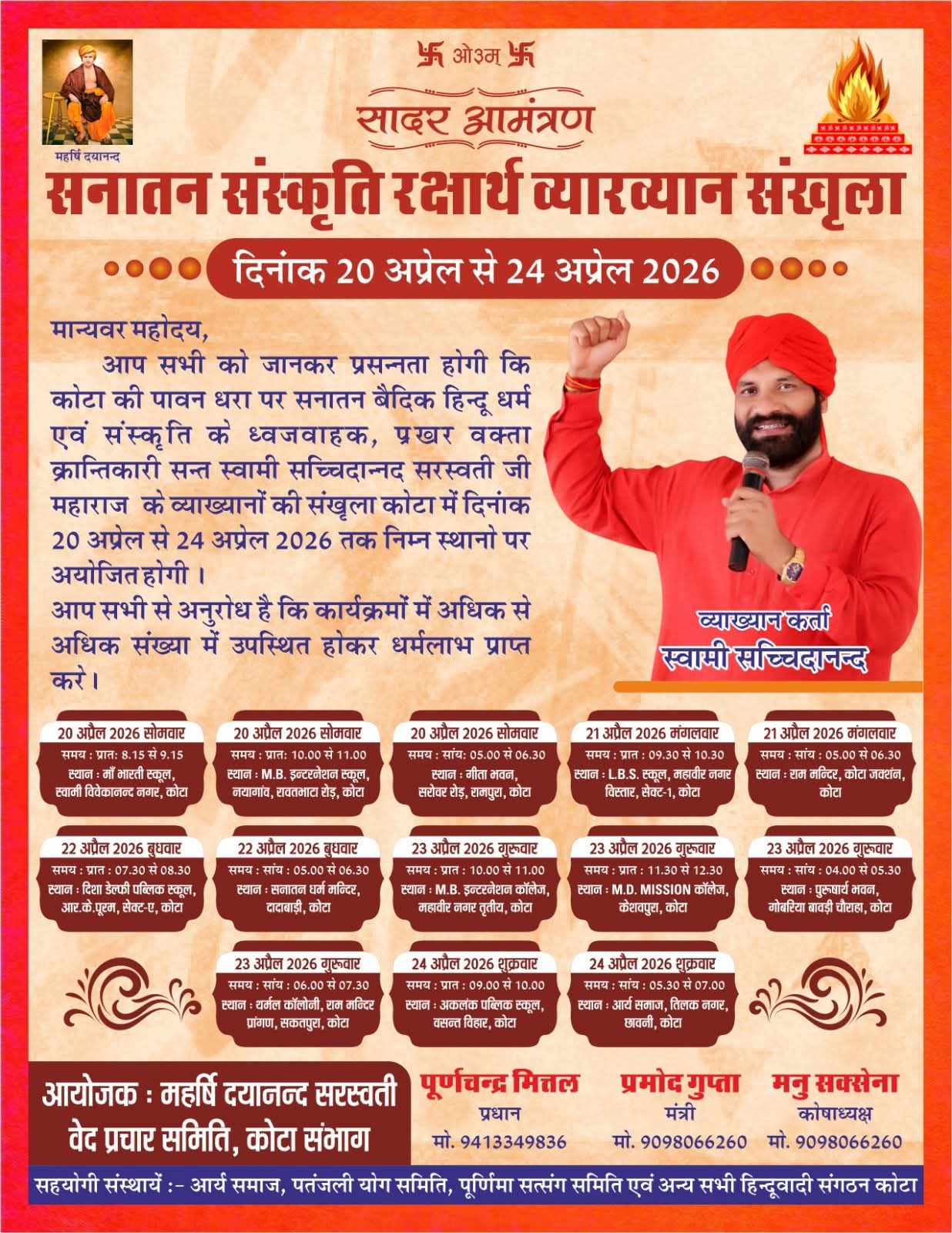 महर्षि दयानन्द सरस्वती वेद प्रचार समिति हाड़ौती परिक्षेत्र, कोटा (राजस्थान) के सानिध्य में 20 अप्रैल से 24 अप्रैल 2026 तक कोटा की पावन धरा पर एक भव्य 5 दिवसीय वेद प्रचार एवं सनातन संस्कृति व्याख्यान श्रृंखला का आयोजन किया जा रहा है। इस आध्यात्मिक एवं सांस्कृतिक कार्यक्रम में सत्य सनातन वैदिक धर्म के प्रखर प्रवक्ता, क्रांतिकारी एवं ओजस्वी वक्ता स्वामी सच्चिदानंद सरस्वती जी महाराज अपने प्रेरणादायी व्याख्यानों के माध्यम से समाज को जागरूक करेंगे।