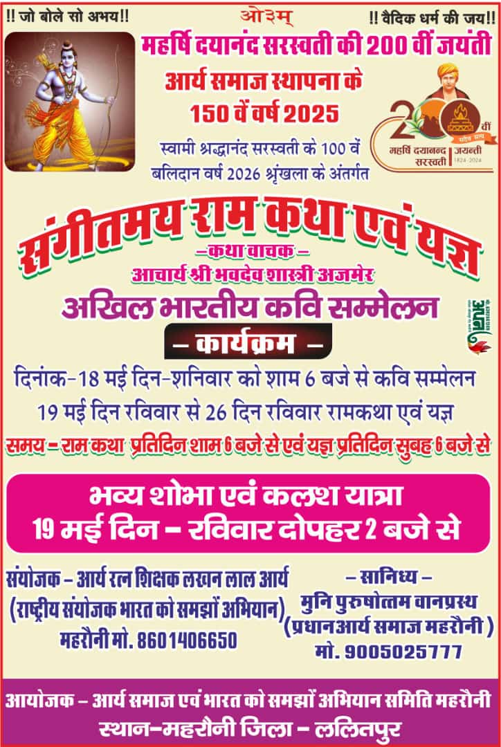 दिनांक-18 मई दिन-शनिवार को शाम 6 बजे से कवि सम्मेलन 19 मई दिन रविवार से 26 दिन रविवार रामकथा एवं यज्ञ ।