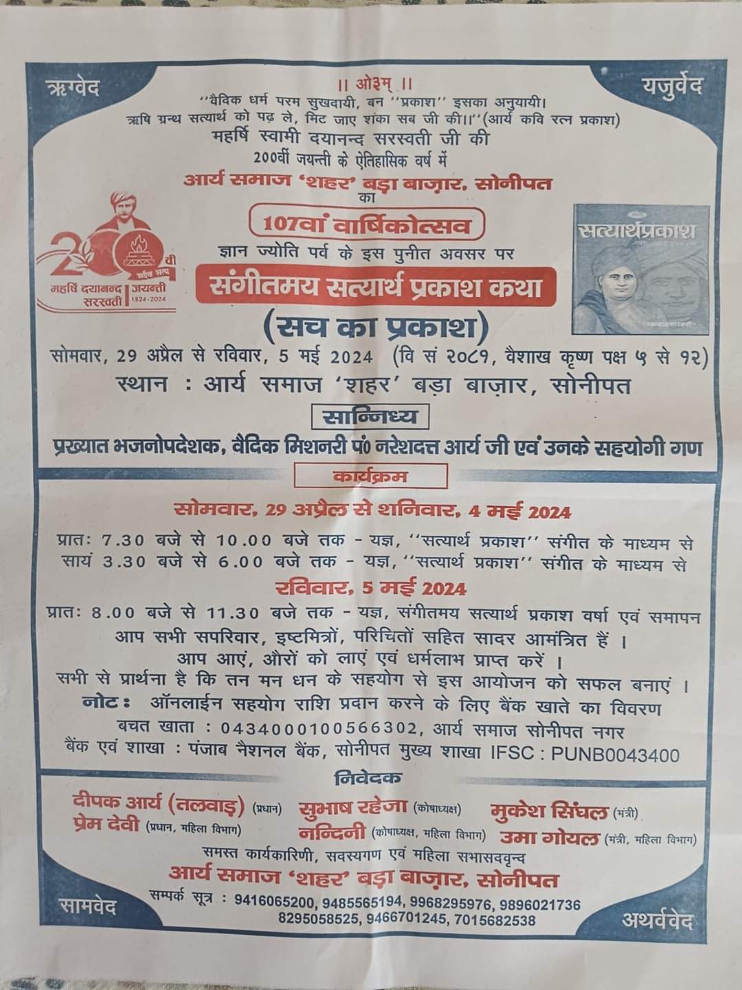 सभी से प्रार्थना है कि तन मन धन के सहयोग से इस आयोजन को सफल बनाएं । नोट: ऑनलाईन सहयोग राशि प्रदान करने के लिए बैंक खाते का विवरण बचत खाता : 0434000100566302, आर्य समाज सोनीपत नगर बैंक एवं शाखा: पंजाब नैशनल बैंक, सोनीपत मुख्य शाखा IFSC : PUNB0043400