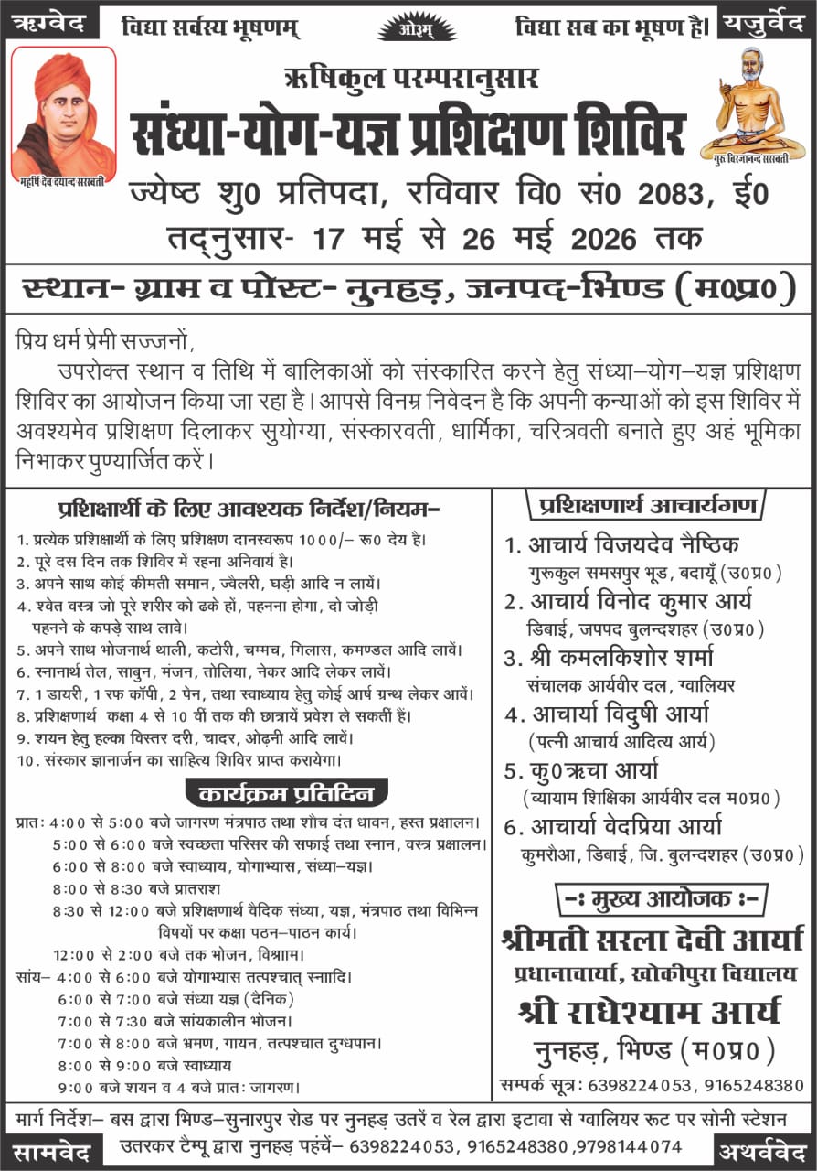 ऋषिकुल परंपरा के अनुसार संध्या-योग-यज्ञ प्रशिक्षण शिविर का भव्य आयोजन ग्राम व पोस्ट नुनहड़, जनपद भिण्ड (मध्य प्रदेश) में किया जा रहा है। यह विशेष शिविर 17 मई 2026 से 26 मई 2026 तक आयोजित होगा। इस शिविर का मुख्य उद्देश्य बालिकाओं एवं छात्राओं को वैदिक संस्कार, योग, यज्ञ, अनुशासन और चरित्र निर्माण की शिक्षा प्रदान करना है।