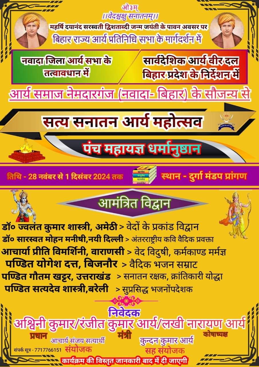 आर्य समाज नेमदारगंज (नवादा- बिहार) के सौजन्य से