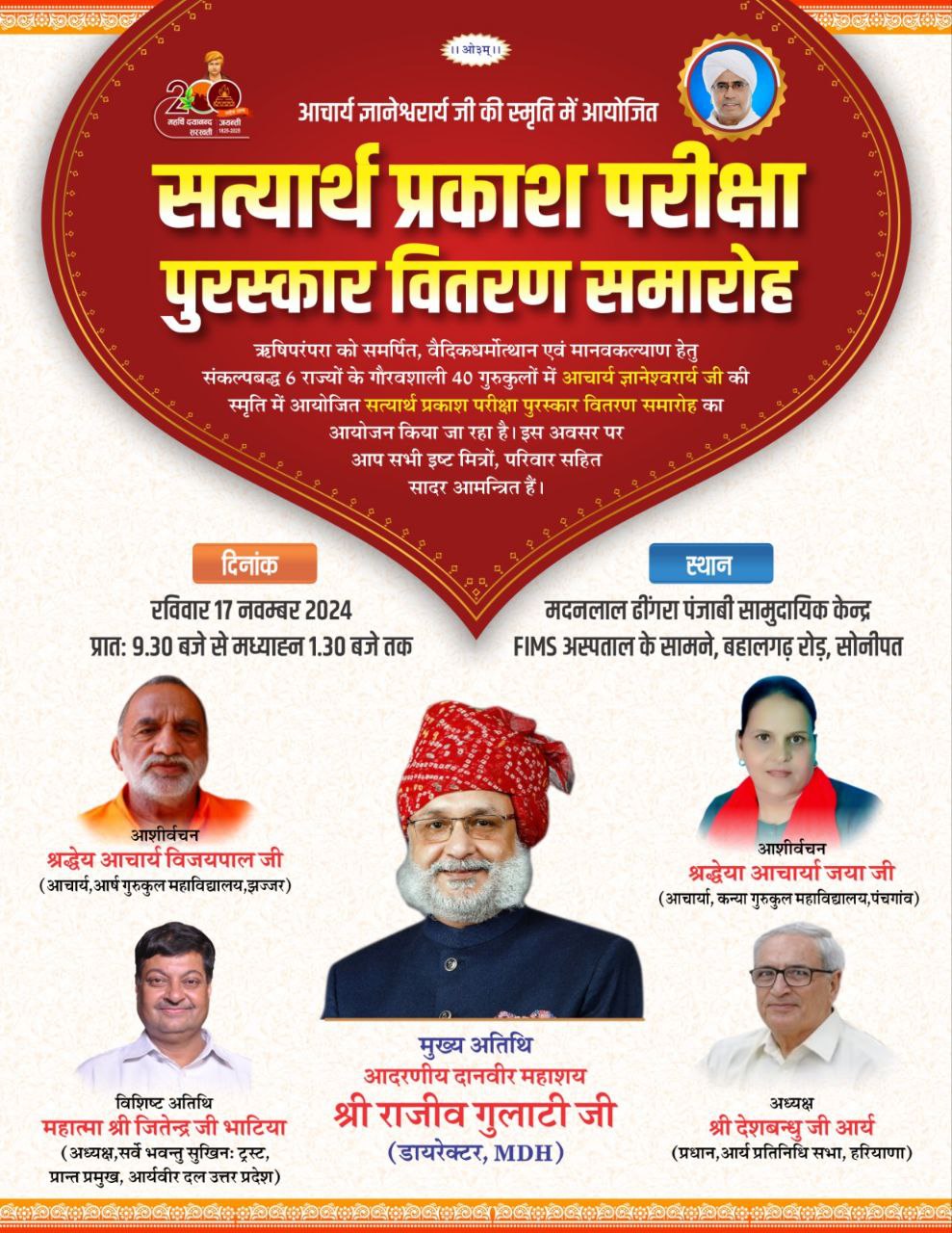 ऋषिपरंपरा को समर्पित, वैदिकधर्मोत्थान एवं मानवकल्याण हेतु संकल्पबद्ध 6 राज्यों के गौरवशाली 40 गुरुकुलों में आचार्य ज्ञानेश्वरार्य जी की स्मृति में आयोजित सत्यार्थ प्रकाश परीक्षा पुरस्कार वितरण समारोह का आयोजन किया जा रहा है। इस अवसर पर आप सभी इष्ट मित्रों, परिवार सहित सादर आमन्त्रित हैं।