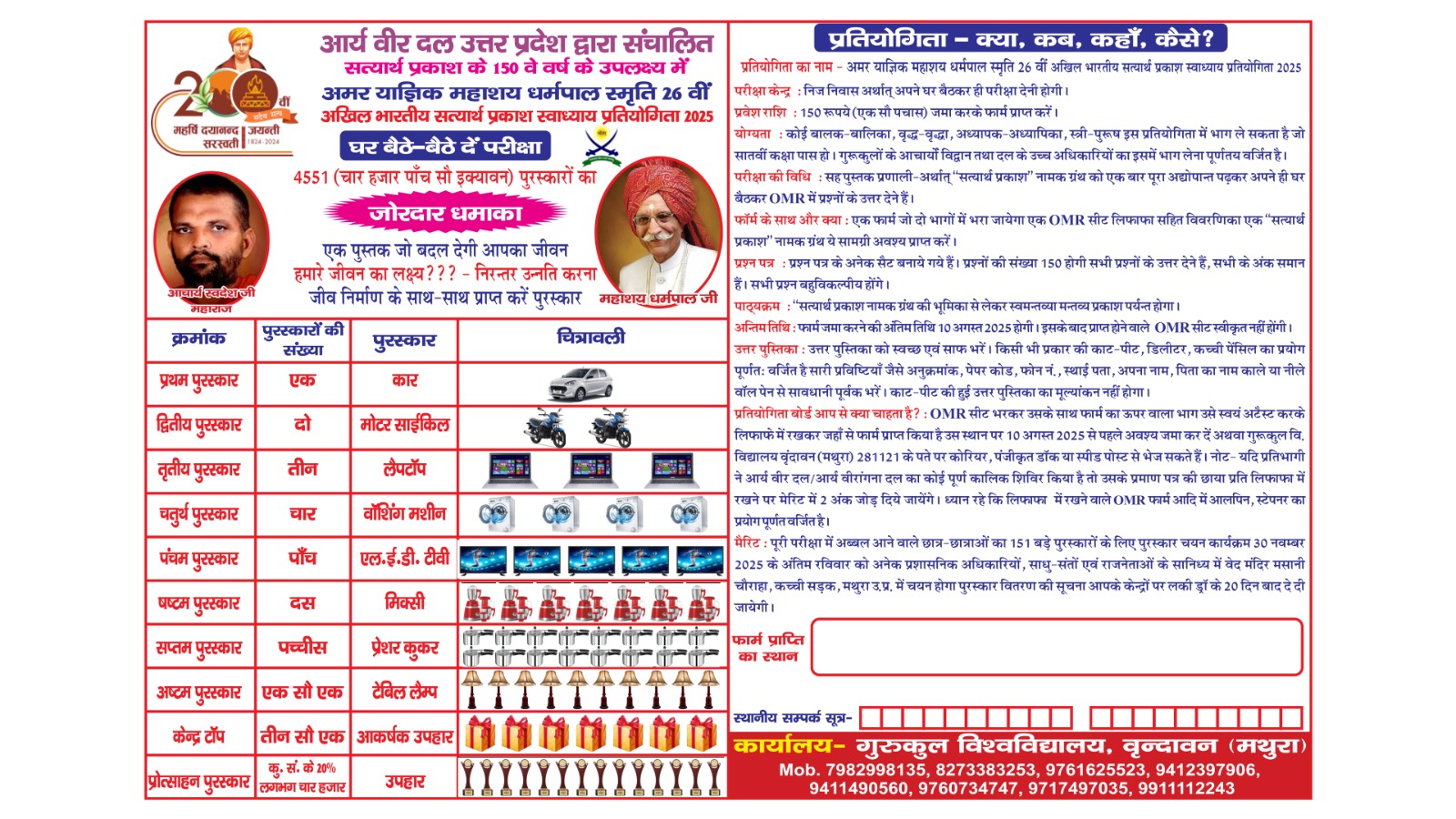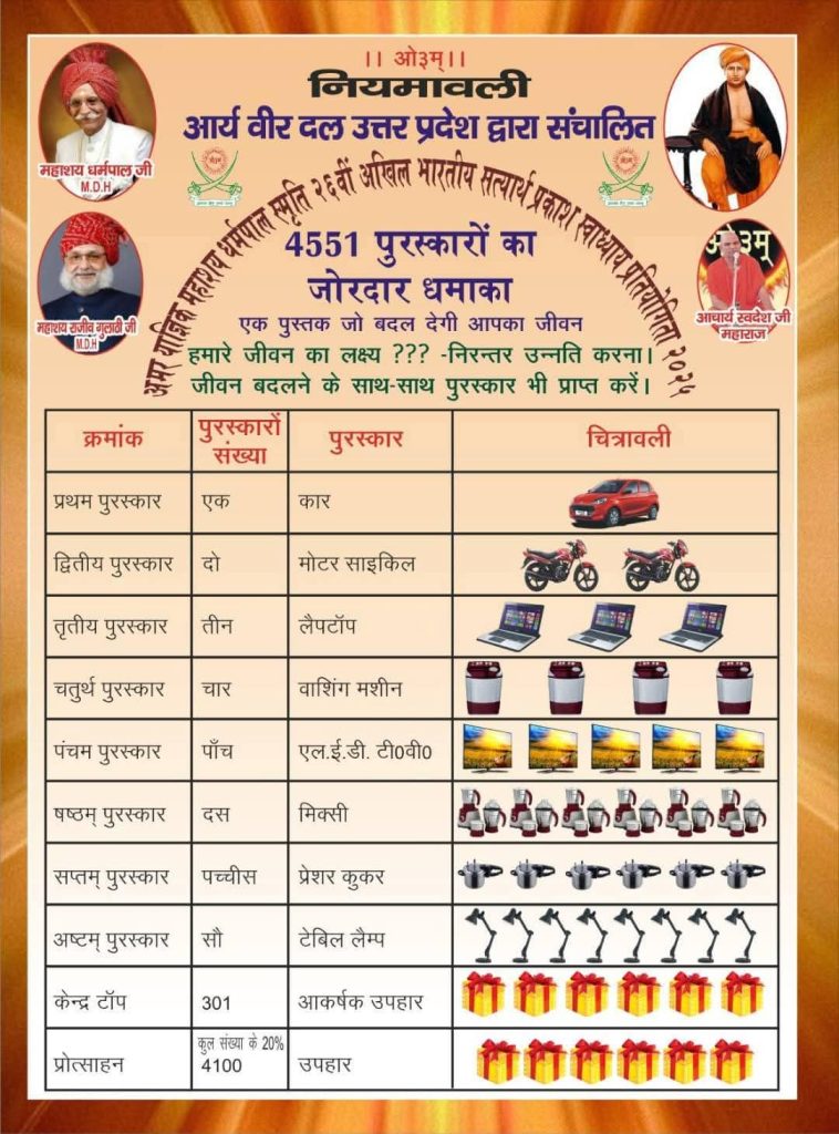 मैरिट– पूरी परीक्षा में अव्वल आने वाले छात्र-छात्राओं का 151 बड़े पुरस्कारों के लिए पुरस्कार चयन कार्यक्रम 30 नवम्बर 2025 के अंतिम रविवार को अनेक प्रशासनिक अधिकारियों, साधु-संतों एवं राजनेताओं के सानिध्य में वेद मंदिर मसानी चौराहा, कच्ची सड़क, मथुरा उ.प्र. में चयन होगा पुरस्कार वितरण की सूचना आपके केन्द्रों पर लकी ड्रॉ के 20 दिन बाद दे दी जायेगी।