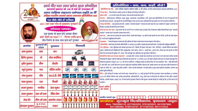 सत्यार्थ प्रकाश के 150वें वर्ष के उपलक्ष्य में अमर याज्ञिक महाशय धर्मपाल स्मृति 26 वीं अखिल भारतीय सत्यार्थ प्रकाश स्वाध्याय प्रतियोगिता 2025