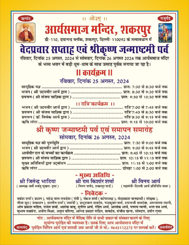 शकरपुर, दिल्ली-110092 के तत्वावधान में वेदप्रचार सप्ताह एवं श्रीकृष्ण जन्माष्टमी पर्व