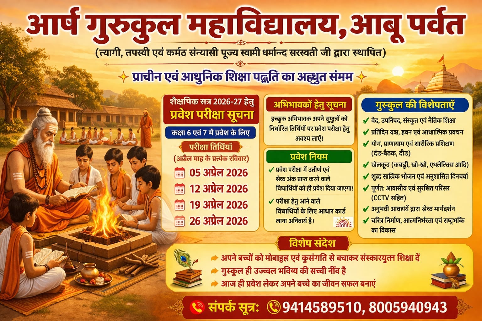 शैक्षणिक सत्र २०२६-२७ के लिए गुरुकुल में कक्षा ६ एवं ७ में प्रवेश की प्रक्रिया अत्यंत पारदर्शी और योग्यता आधारित रखी गई है। अभिभावक ध्यान दें कि प्रवेश के लिए अप्रैल २०२६ के प्रत्येक रविवार को परीक्षा आयोजित की जाएगी: