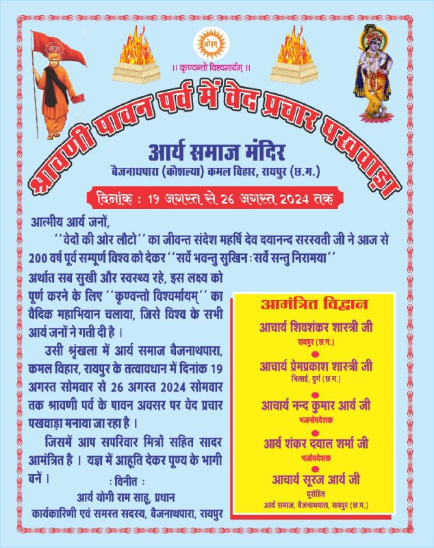 उसी श्रृंखला में आर्य समाज बैजनाथपारा, कमल विहार, रायपुर के तत्वावधान में दिनांक 19 ॐ अगस्त सोमवार से 26 अगस्त 2024 सोमवार तक श्रावणी पर्व के पावन अवसर पर वेद प्रचार पखवाड़ा मनाया जा रहा है। जिसमें आप सपरिवार मित्रों सहित सादर आमंत्रित है। यज्ञ में आहूति देकर पूण्य के भागी बनें ।