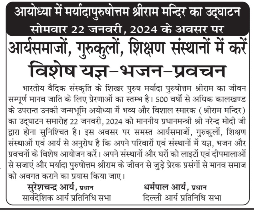 भारतीय वैदिक संस्कृति के शिखर पुरुष मर्यादा पुरुषोत्तम श्रीराम का जीवन सम्पूर्ण मानव जाति के लिए प्रेरणाओं का स्तम्भ है। 500 वर्षों से अधिक कालखण्ड के उपरान्त उनकी जन्मभूमि अयोध्या में भव्य और विशाल स्मारक (श्रीराम मन्दिर) का उद्घाटन समारोह 22 जनवरी, 2024 को माननीय प्रधानमन्त्री श्री नरेन्द्र मोदी जी द्वारा होना सुनिश्चित है। इस अवसर पर समस्त आर्यसमाजों, गुरुकुलों, शिक्षण संस्थाओं एवं आर्य से अनुरोध है कि अपने परिवारों एवं संस्थानों में यज्ञ, भजन और प्रवचनों के विशेष आयोजन करें। अपने संस्थानों और घरों को लाइटों एवं दीपमालाओं – से सजाएं और मर्यादा पुरुषोत्तम श्रीराम के जीवन से जुड़े प्रेरक प्रसंगों से मानव समाज को अवगत कराने का प्रयास किया जाए।