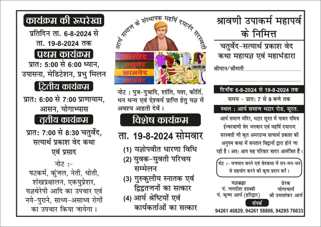 आर्य समाज मंदिर, भटार रोड, सुरत में पावन पवित्र ईश्वर वाणी वेद भगवान एवं महर्षि दयानंद सरस्वती जी कृत अमरग्रंथ सत्यार्थ प्रकाश की अनुपम कथा होने जा रही है । अतः आप सह परिवार सादर आमंत्रित है ।