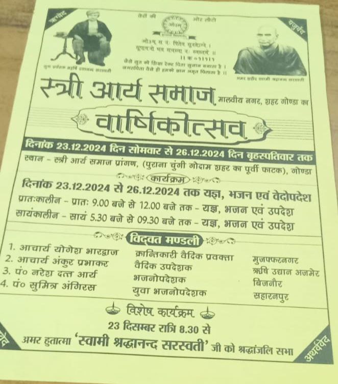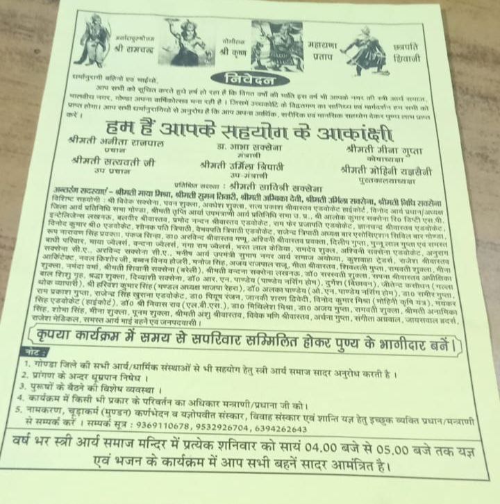 1. गोण्डा जिले की सभी आर्य/धार्मिक संस्थाओं से भी सहयोग हेतु स्त्री आर्य समाज सादर अनुरोध करती है।