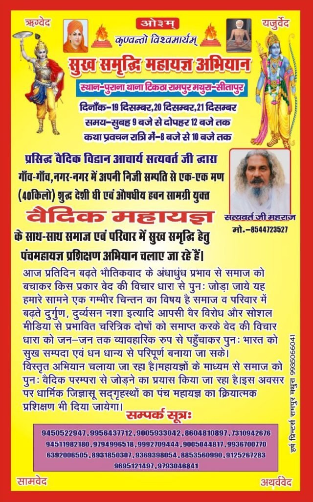 प्रसिद्ध वैदिक विद्वान आचार्य सत्यवर्त जी द्वारा गाँव-गाँव, नगर-नगर में अपनी निजी सम्पति से एक-एक मण (40 किलो) शुद्ध देशी घी एवं औषधीय हवन सामग्री युक्त वैदिक महायज्ञ के साथ-साथ समाज एवं परिवार में सुख समृद्धि हेतु पंचमहायज्ञ प्रशिक्षण अभियान चलाए जा रहे हैं।