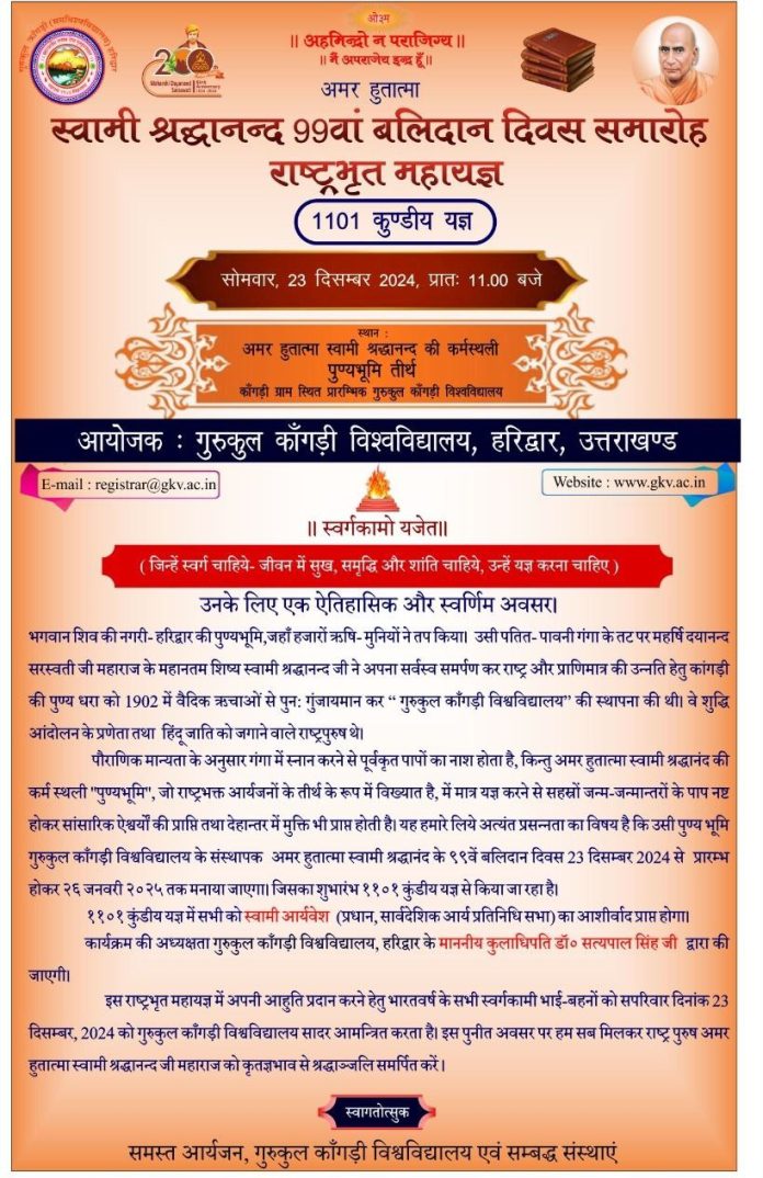 पौराणिक मान्यता के अनुसार गंगा में स्नान करने से पूर्वकृत पापों का नाश होता है, किन्तु अमर हुतात्मा स्वामी श्रद्धानंद की कर्म स्थली “पुण्यभूमि”, जो राष्ट्रभक्त आर्यजनों के तीर्थ के रूप में विख्यात है, में मात्र यज्ञ करने से सहस्रों जन्म-जन्मान्तरों के पाप नष्ट होकर सांसारिक ऐश्वर्यों की प्राप्ति तथा देहान्तर में मुक्ति भी प्राप्त होती है। यह हमारे लिये अत्यंत प्रसन्नता का विषय है कि उसी पुण्य भूमि गुरुकुल काँगड़ी विश्वविद्यालय के संस्थापक अमर हुतात्मा स्वामी श्रद्धानंद के ९९वें बलिदान दिवस 23 दिसम्बर 2024 से प्रारम्भ होकर २६ जनवरी २०२५ तक मनाया जाएगा। जिसका शुभारंभ ११०१ कुंडीय यज्ञ से किया जा रहा है।